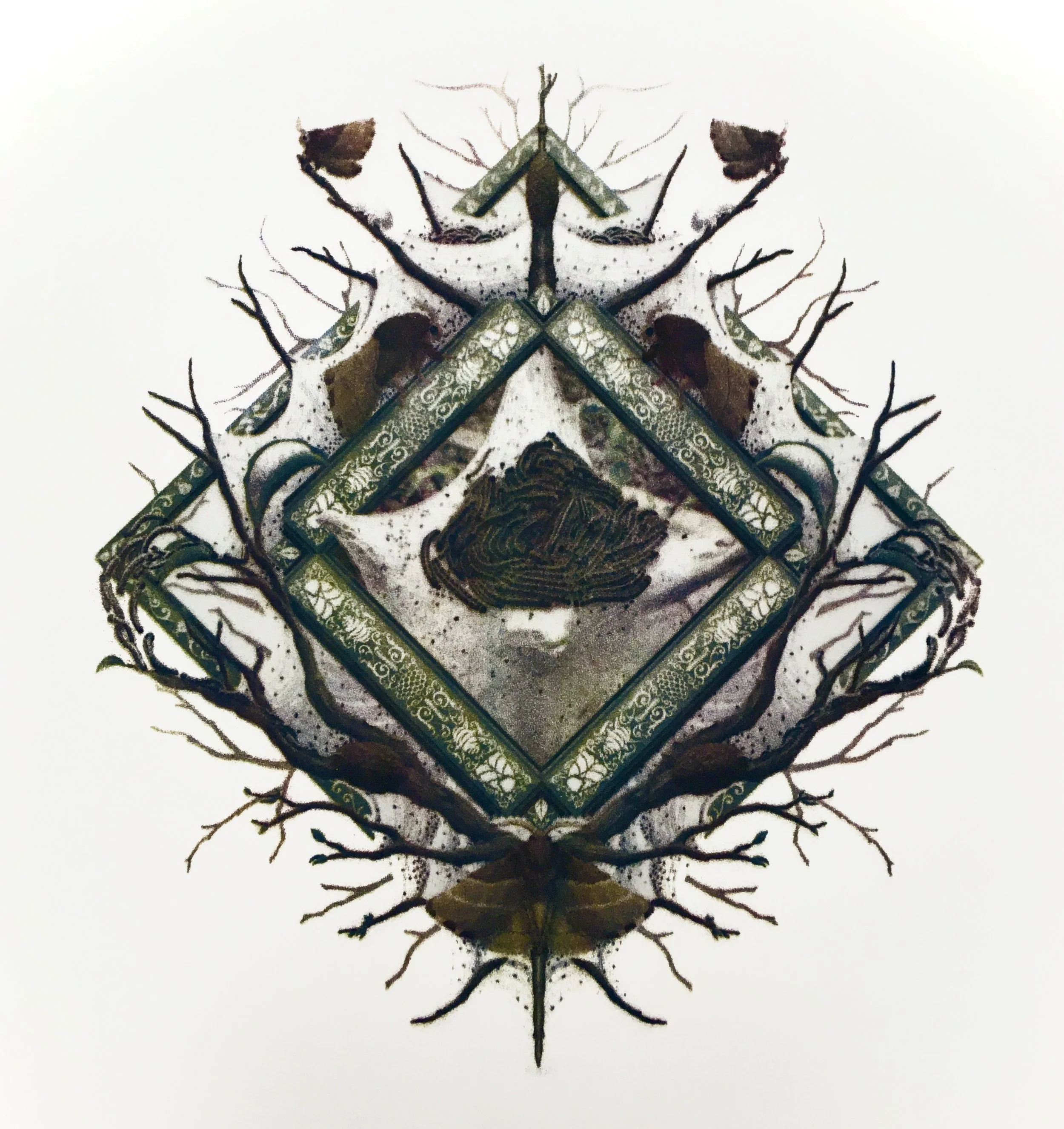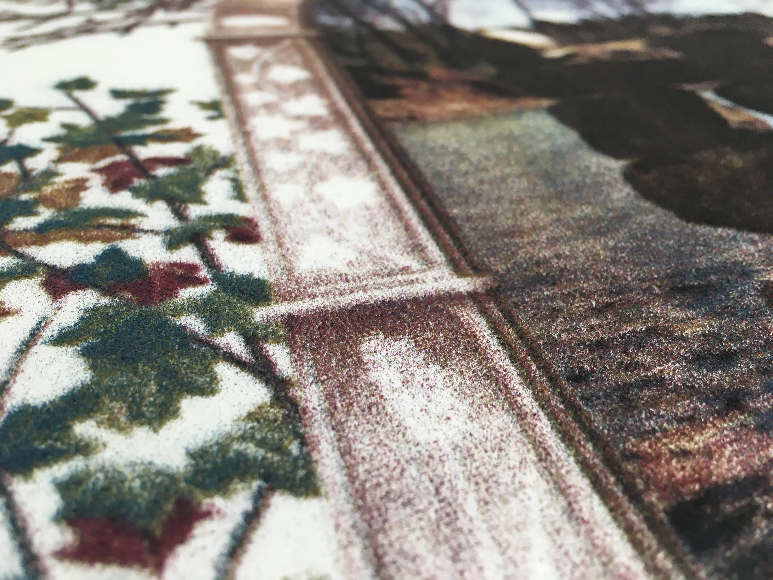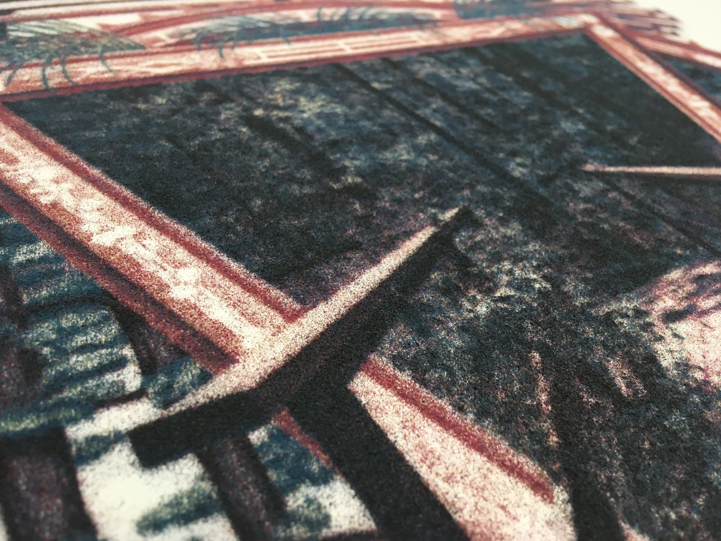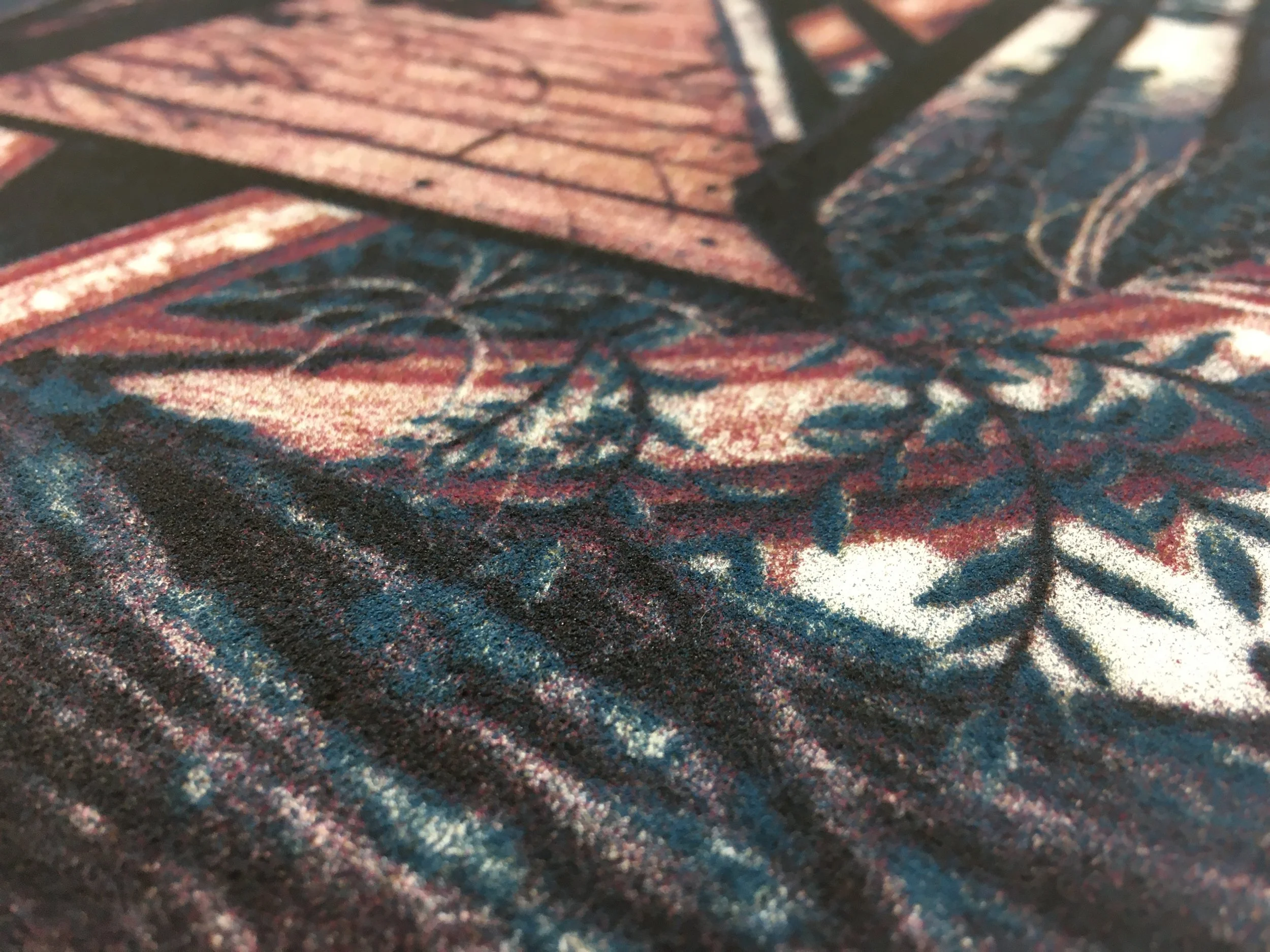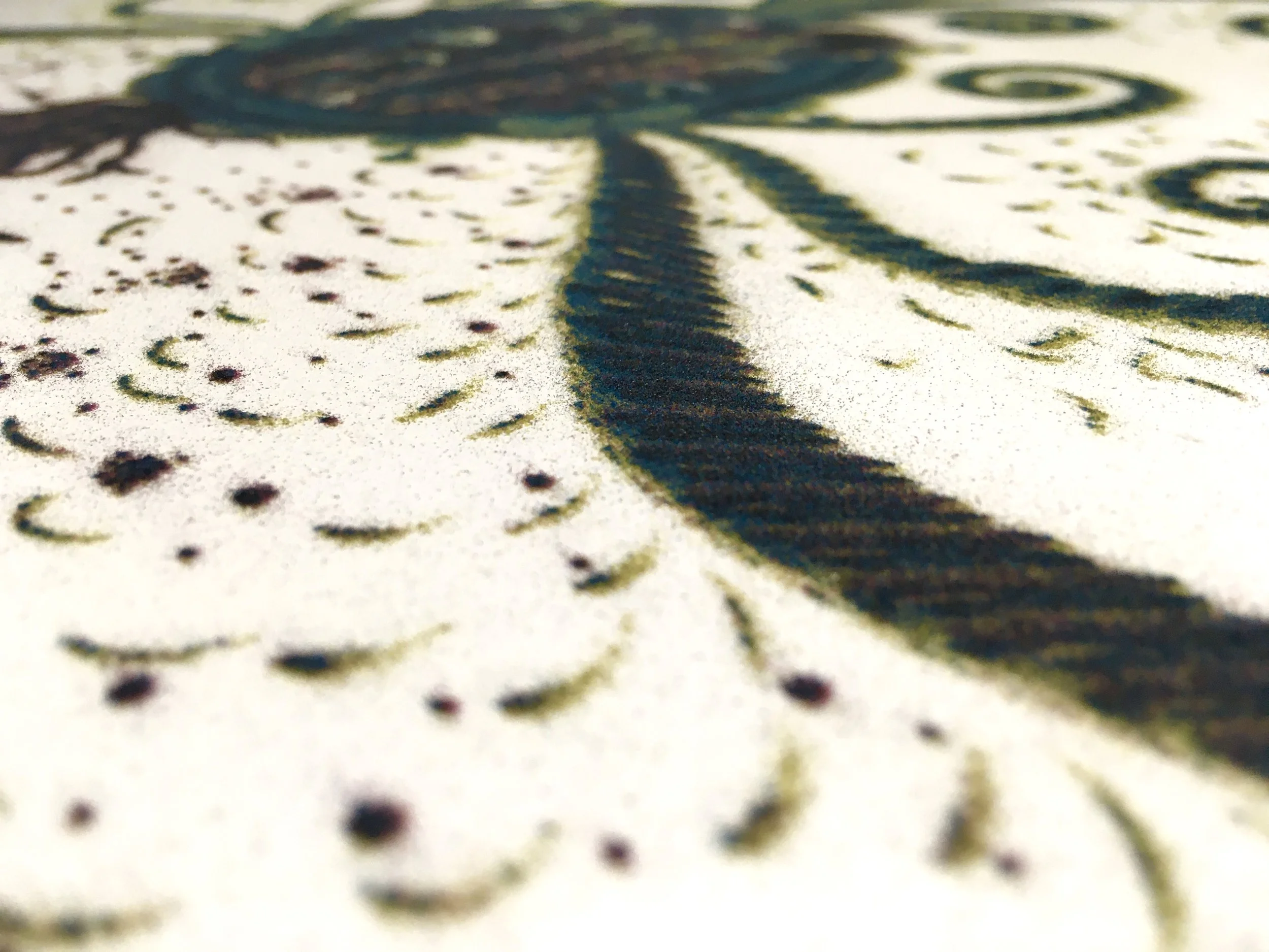 Using primarily CMYK silkscreen printing techniques, these ephemeral prints are created out of materials that have been filtered, dyed, and pulverized. Each layer of the print lies loose on the surface, and they are susceptible to the slightest breeze or touch.